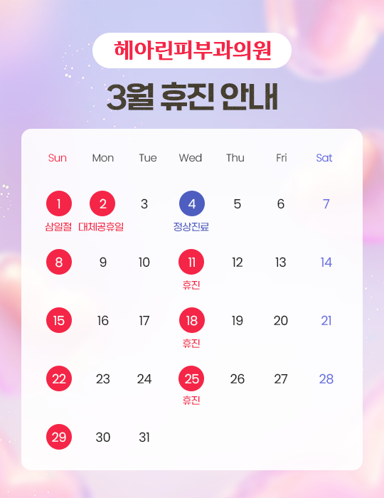 * 수요일 휴진 (단, 주중 공휴일 있을 경우는 수요일 진료합니다.)